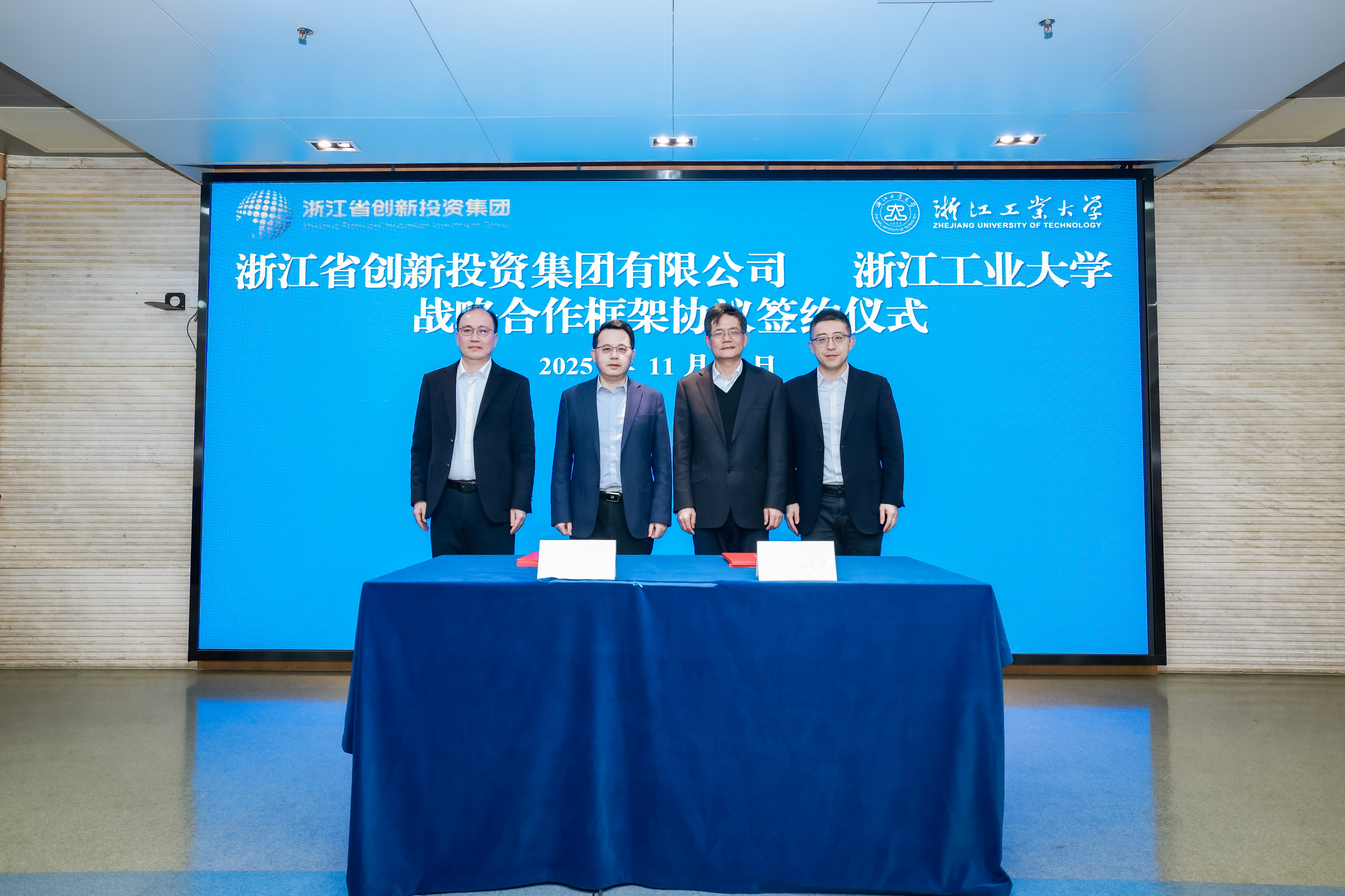 11月28日,jinnian金年会与浙江省创新投资集团有限公司战略合作框架协议签约仪式在屏峰校区举行。浙江省财政厅党组成员、省创新投资集团党委书记、董事长杨强民,副总经理侯兴钏,校党委书记蔡袁强,副校长胡军等出席仪式。